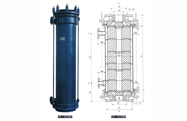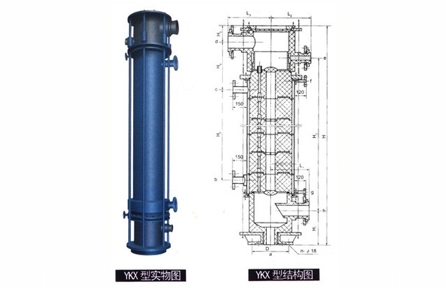 YKA型圓塊式石墨熱交換器以圓柱 體型單元積木式疊裝而成,結(jié)構(gòu)強(qiáng)度高,石墨件間墊以四氟質(zhì)或特種橡膠質(zhì)等質(zhì) 地密封件.密封可靠,設(shè)備導(dǎo)熱效率高,耐溫、抗沖擊、耐壓等性能優(yōu)越。本型設(shè)備分成I型與II型,I型載熱體切向進(jìn)入換熱塊,相鄰兩塊方向錯(cuò)開,縱向物料經(jīng)短 通逐塊再分配而紊流效應(yīng)顯著,下封頭附 加氣液分離的則成冷凝器,若上封頭改成 蒸發(fā)室則形成蒸發(fā)器。YKA-II型載熱體徑 向進(jìn)入換熱塊,殼體按外折