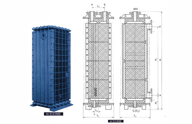 矩型塊孔式石墨熱交換器由截面為矩形的單元換熱塊疊裝而成,整體強(qiáng)度高,耐熱沖擊性能好,傳熱效率高使用壽命長,本公司常規(guī)生產(chǎn)均為內(nèi)聯(lián)式單向耐 腐蝕JK型與KS型兩系列,JK型側(cè)板為小塊,規(guī)格變化容易維修方便,KS型側(cè)板為 整體,增加上、下兩排緊固鏍柱.載熱體 分布更均勻。相同換熱面積時(shí)矩形塊孔式 設(shè)備高度比圓塊式小。本公司可根據(jù)用戶 要求生產(chǎn)外聯(lián)式、臥式安裝,雙向耐腐蝕 等具有其它特性之矩形塊孔式石墨